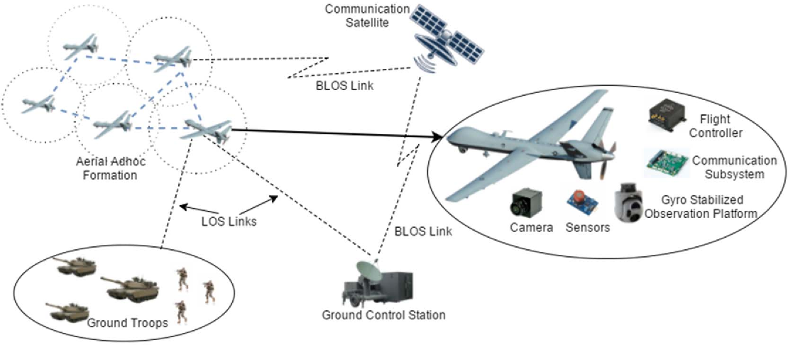 Drone-to-drone communication links can be used for swarm coordination (position, intent, and task coordination) as well as mesh network for payload, control, and video relaying for BLOS purposes.